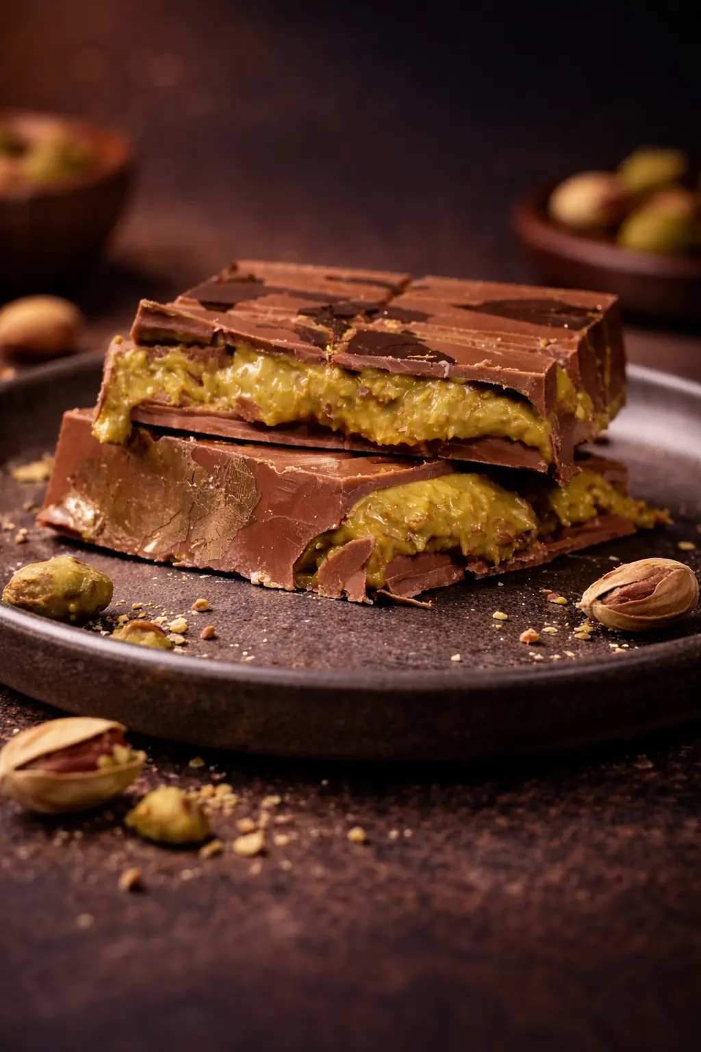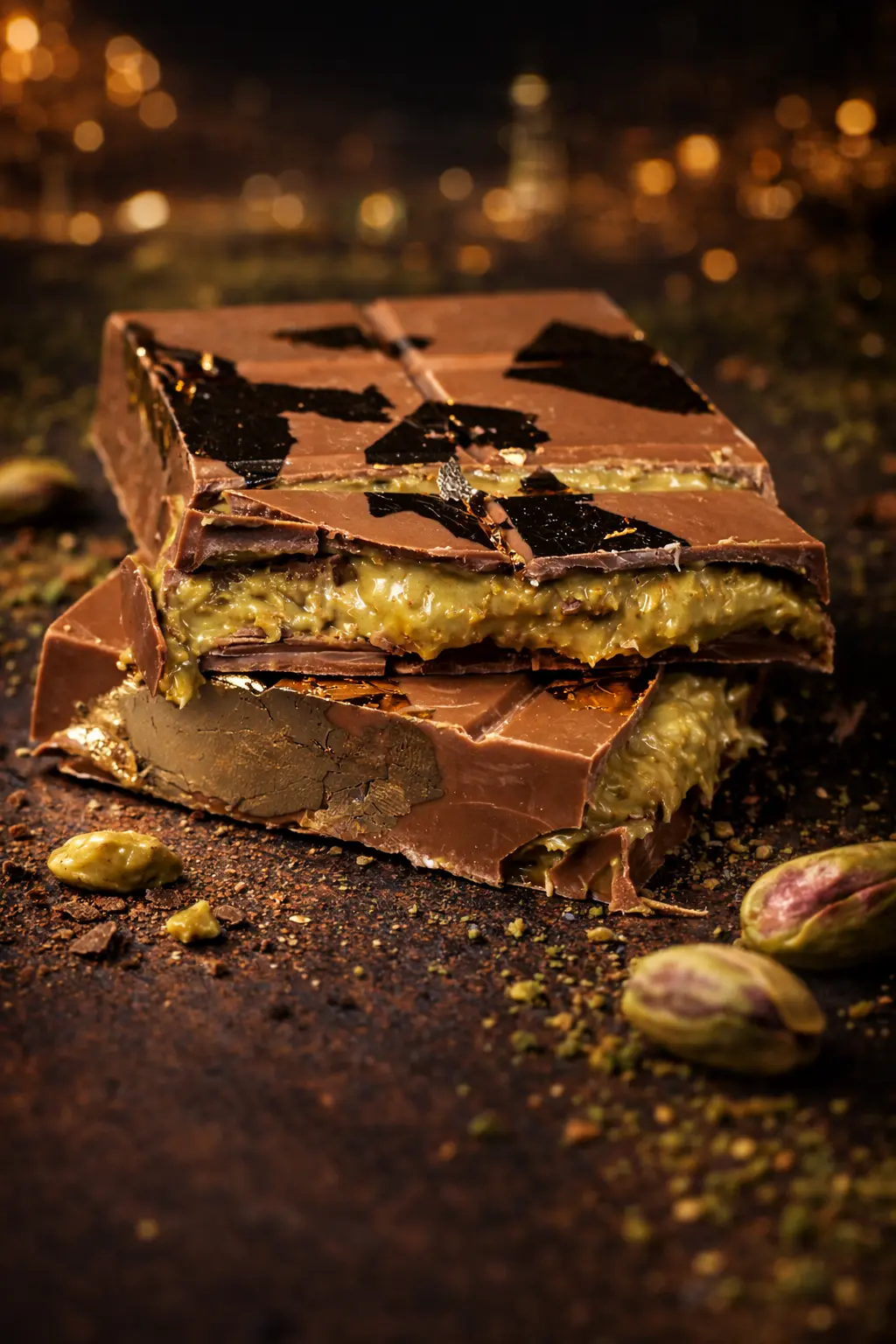 Najkremastiji pistać fil i najhrskaviji kadaif, zarobljeni u vrhunskoj mlečnoj čokoladi. Zvuk hrskanja koji se pamte.