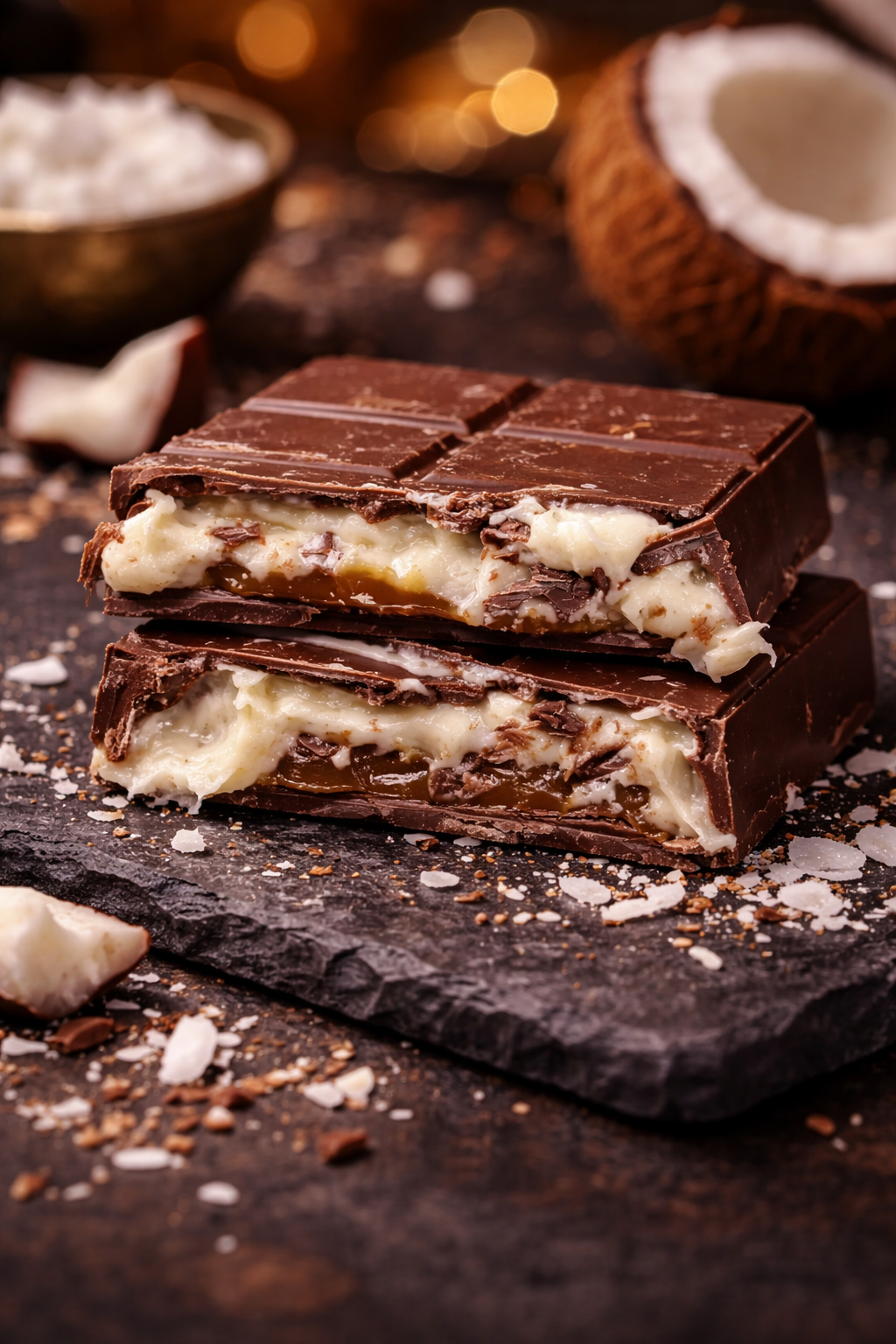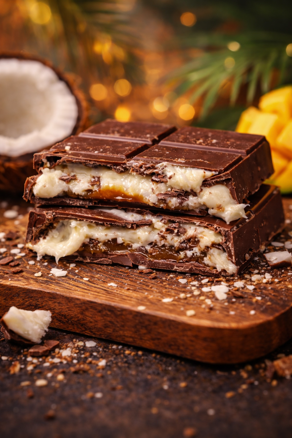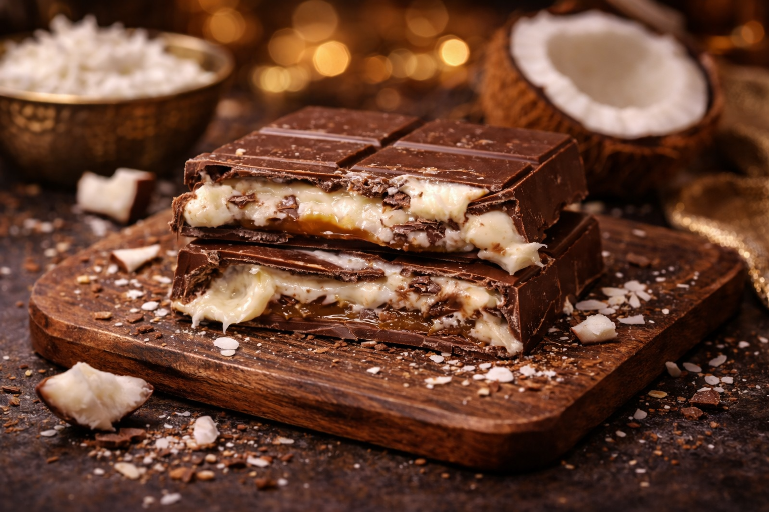 Egzotika u svakom zalogaju. Naša ručno rađena premium čokolada sa bogatim, kremastim punjenjem od pravog kokosa donosi savršen balans slatkoće i nežne teksture.